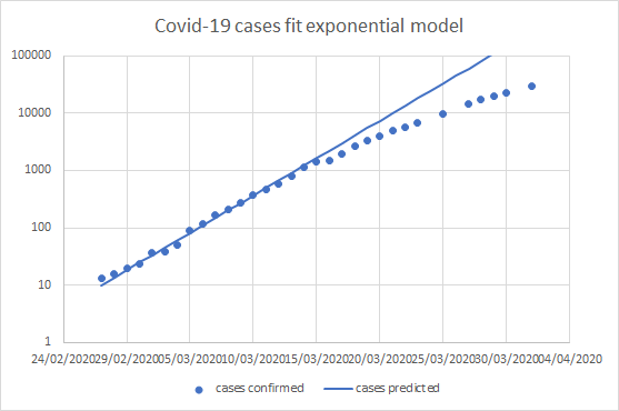 A simple model of the cases recorded by the WHO would appear to fit the data nicely, as seen on the log-y graph versus date above, at least in the first 20 days. So in just a few days, the UK will have 10,000 cases, which is very serious, but now cases are heading beyond, but the growth rate is slowing. The growth in the cases for 20 days looks almost precisely exponential, with a growth factor of 0.3 per day in the formula: