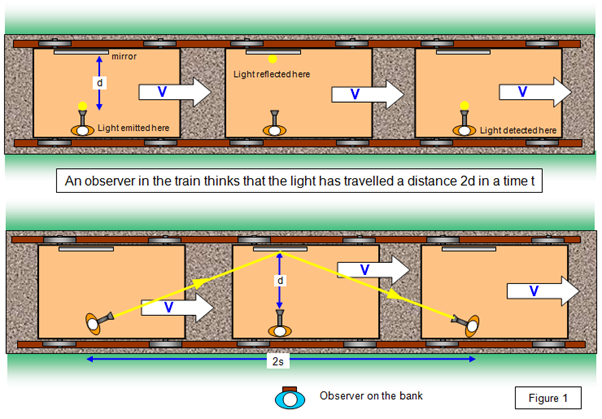 Train width L, moving at v. Inside the train, a light beam pulse hits the sides at intervals of just L/c = t. Viewed from the platform, light pulse has to go further, from side to side L and along by vt’, along a diagonal. Note that light always goes at speed c, no matter what speed the train goes.