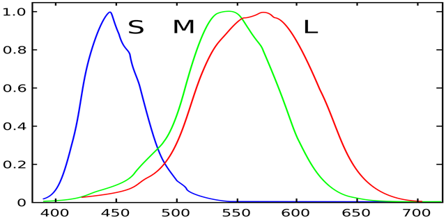 The amber-green area is crucial, because the colour receptors (cone cells) in the human eye are very close in their sensitivity to light of different wavelengths in this part of the spectrum.