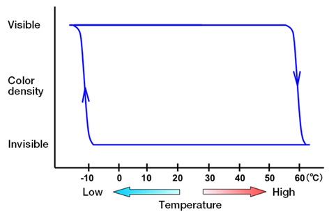 Thermographic ink is ‘simply’ ink that changes colour with temperature. There are many different varieties. Some change once, some change over just a few degrees, some do other things. The types we are looking for change to one colour when heated way above room temperature (typically colourless) and ‘lock’ in that colour until subcooled hugely below room temperature, when they they change back to their original (usually coloured) form, and they then lock into that. They are normally made by developing further the subtle chemistry of leuco dyes.