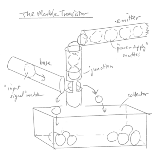 You should find that, if all is well, for every single marble that you drop down the base tube, two marbles, or maybe three, end up in the collector. I named this device the ‘marble transistor’ because it gives you a useful mental model of a semiconductor transistor, at least as far as using transistors is concerned. (But don’t think that anything like this happens inside a semiconductor ! )