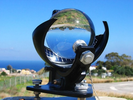 A Marble Sun recorder burns a linear hole in a paper strip placed at the correct distance, angled correctly to horizontal according to season & latitude – length of linear hole give sunlight for the day. You can thermal fax paper with smaller marble for miniature version – has advantage that it doesn’t burn a hole completely through the paper and is more sensitive. Although simply using medium brown or grey paper will allow smaller marbles to work. This kind of paper absorbs better and thus heats up and burns quicker. And the sun recorder will also work with magnetic tape, as used in video and audio recorders, giving an even bigger advantages in sensitivity.