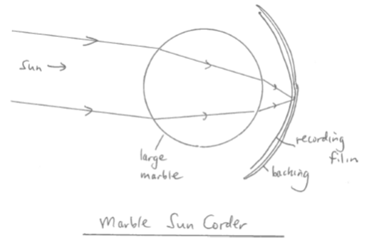 If you can get hold of a truly huge marble (bigger than 22mm – 50mm or more in diameter is possible), then you have three advantages: firstly you won’t have to work quite so hard to find a sensitive recording paper, secondly, you won’t have to locate the paper quite so accurately at the correct distance from the centre of the marble, and thirdly, your Marble Suncorder will work when the sun is relatively low in the sky, and even when there is hazy cloud.