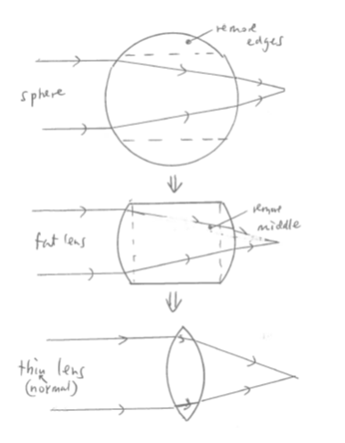 Most lens made by grinding a portion of a sphere onto the surface – which is most lenses – suffer what is known as spherical aberration. This means that they only form an exact, pin-sharp focus, for light rays very close to the axis. At larger angles to the axis, the focus will be slightly closer, or possibly slightly further, from axial focus. A sphere has a generous dose of this distortion, needless to say. Surprisingly, however, this distortion is reduced by the great thickness of the lens, which compensates.