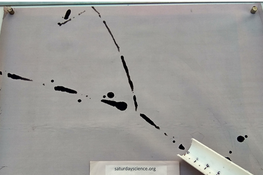 Large Marble Collider experiments on a slope: to add another dimension – that of speed measurement – to marble collisions – requires that you do the whole collision on a slope. As we now know, the curvature of the track tells us about the velocity of the marble, at least the horizontal component of velocity. If you looked closely at the picture above, you will noticed a slight curvature in the upper track – this was accidental, since the board was resting on a table which was not quite horizontal. The picture below shows a collision on a deliberate slope, with the stationary marble resting on a tiny piece of grit before the collision.