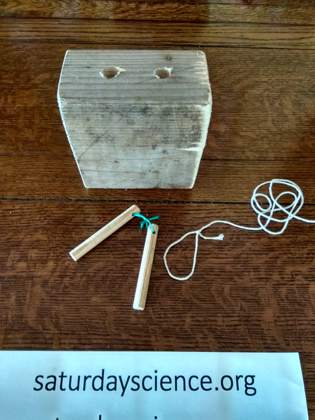 What you do: Take a large block of wood, say 1kg to 5kg, and two short length of round wooden dowel rod, say 5cm to 8cm long, 12mm diameter. Drill two small holes near the of the dowel rods big enough for strong string to be threaded through. Now drill two holes vertically in the block, symmetrically either side of the centre of the block 5 or 10cm apart. They should be just large enough for the round dowels to be pushed in, deep enough for just their last couple of cm to be sticking out.